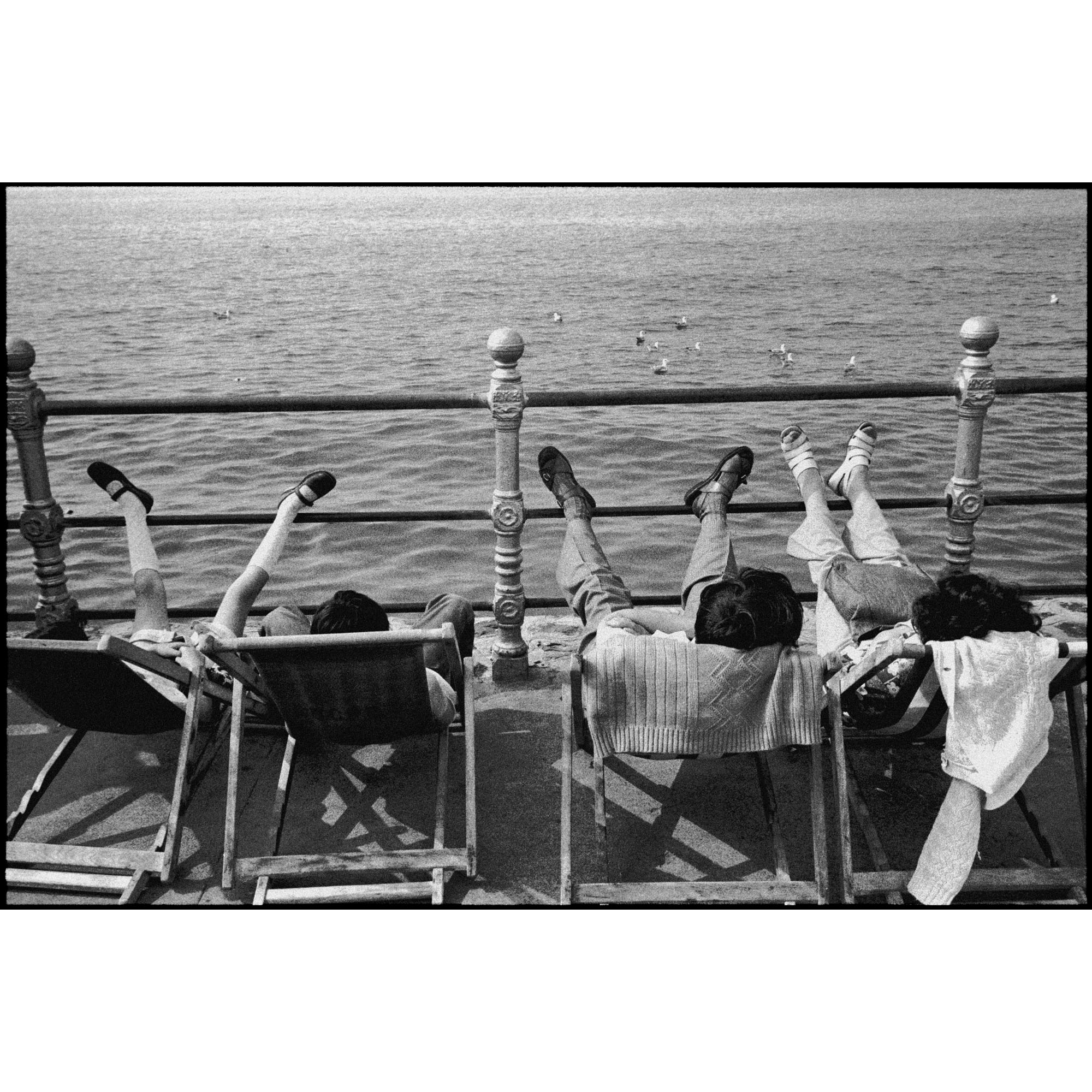 Blackpool, England, 1975. Holidaymakers lounge in deckchairs along the seafront, as they watch the play of birds and light on the water.