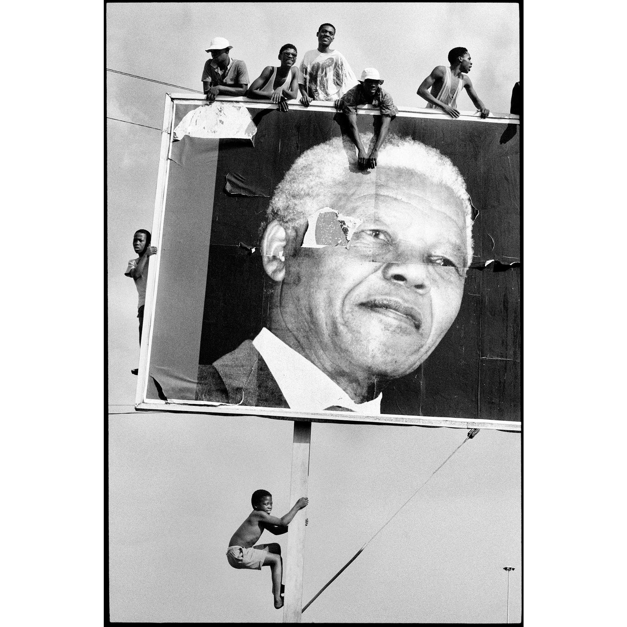 South Africa, 1994. In a Natal township, supporters scale every vantage point, straining for a glimpse of Mandela’s long-awaited arrival.